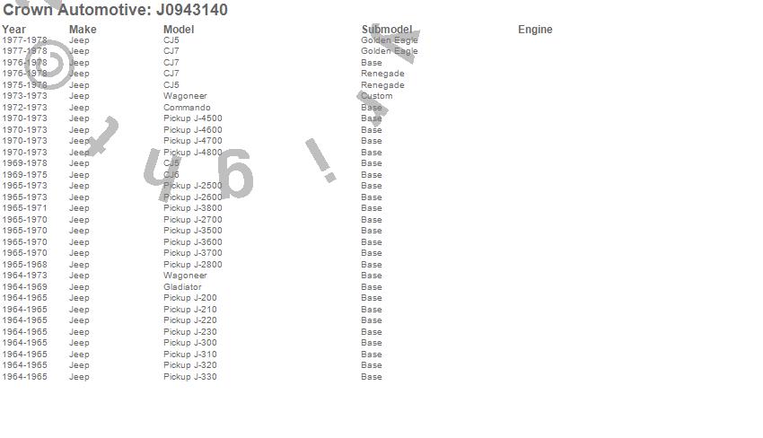 Crown Automotive is the premier manufacturer and distributor of quality replacement parts for Jeep® CJ™, Wrangler™, Cherokee™, Grand Cherokee™, Liberty™, and Commander™."From humble beginnings in 1963 in a small Boston storefront, Crown Automotive has consistently maintained its commitment to offering only quality parts and exceptional service. Today, with warehouses in Massachusetts, Georgia, Nevada, Spain, and the Czech Republic, totaling over 160,000 square feet, Crown Automotive continues to be the leader in quality replacement parts for Jeep® vehicles. With over 8,000 different parts in stock for Jeep® vehicles from 1942 on up, Crown has the largest stock of replacement parts for Jeep® vehicles, including factory-discontinued parts. In fact, many of the older Jeeps are still on (and off) the road thanks to Crown parts. The Crown line consists of axle, body, brake, clutch, cooling, driveline, electrical, engine, exhaust, fuel, steering, suspension, transmission and transfer case components. Crown Automotive also offers an exclusive line of component kits and accessory products. Because we know that Jeeps are driven harder than most other vehicles, we emphasize offering only quality parts. In fact, we test parts on Jeeps before distributing them to our dealers to insure that they meet our standards for quality. Crown also supports its entire line with a 12 month/12,000 mile warranty to insure our dealers and their customers of our commitment to offering quality parts. We know from experience that Jeep® owners would rather pay a little more for a good quality part that's backed by a strong guarantee. But we know that price is important as well. So, not only will you find Crown parts to be of exceptional quality, but you'll find them at a great price too.