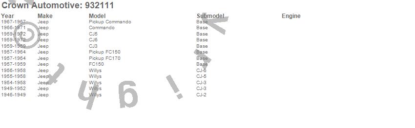 Crown Automotive is the premier manufacturer and distributor of quality replacement parts for Jeep® CJ™, Wrangler™, Cherokee™, Grand Cherokee™, Liberty™, and Commander™."From humble beginnings in 1963 in a small Boston storefront, Crown Automotive has consistently maintained its commitment to offering only quality parts and exceptional service. Today, with warehouses in Massachusetts, Georgia, Nevada, Spain, and the Czech Republic, totaling over 160,000 square feet, Crown Automotive continues to be the leader in quality replacement parts for Jeep® vehicles. With over 8,000 different parts in stock for Jeep® vehicles from 1942 on up, Crown has the largest stock of replacement parts for Jeep® vehicles, including factory-discontinued parts. In fact, many of the older Jeeps are still on (and off) the road thanks to Crown parts. The Crown line consists of axle, body, brake, clutch, cooling, driveline, electrical, engine, exhaust, fuel, steering, suspension, transmission and transfer case components. Crown Automotive also offers an exclusive line of component kits and accessory products. Because we know that Jeeps are driven harder than most other vehicles, we emphasize offering only quality parts. In fact, we test parts on Jeeps before distributing them to our dealers to insure that they meet our standards for quality. Crown also supports its entire line with a 12 month/12,000 mile warranty to insure our dealers and their customers of our commitment to offering quality parts. We know from experience that Jeep® owners would rather pay a little more for a good quality part that's backed by a strong guarantee. But we know that price is important as well. So, not only will you find Crown parts to be of exceptional quality, but you'll find them at a great price too.