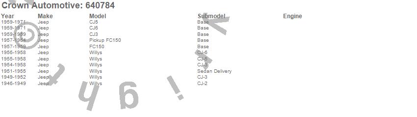 Crown Automotive is the premier manufacturer and distributor of quality replacement parts for Jeep® CJ™, Wrangler™, Cherokee™, Grand Cherokee™, Liberty™, and Commander™."From humble beginnings in 1963 in a small Boston storefront, Crown Automotive has consistently maintained its commitment to offering only quality parts and exceptional service. Today, with warehouses in Massachusetts, Georgia, Nevada, Spain, and the Czech Republic, totaling over 160,000 square feet, Crown Automotive continues to be the leader in quality replacement parts for Jeep® vehicles. With over 8,000 different parts in stock for Jeep® vehicles from 1942 on up, Crown has the largest stock of replacement parts for Jeep® vehicles, including factory-discontinued parts. In fact, many of the older Jeeps are still on (and off) the road thanks to Crown parts. The Crown line consists of axle, body, brake, clutch, cooling, driveline, electrical, engine, exhaust, fuel, steering, suspension, transmission and transfer case components. Crown Automotive also offers an exclusive line of component kits and accessory products. Because we know that Jeeps are driven harder than most other vehicles, we emphasize offering only quality parts. In fact, we test parts on Jeeps before distributing them to our dealers to insure that they meet our standards for quality. Crown also supports its entire line with a 12 month/12,000 mile warranty to insure our dealers and their customers of our commitment to offering quality parts. We know from experience that Jeep® owners would rather pay a little more for a good quality part that's backed by a strong guarantee. But we know that price is important as well. So, not only will you find Crown parts to be of exceptional quality, but you'll find them at a great price too.