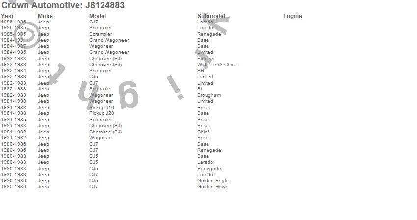 Crown Automotive is the premier manufacturer and distributor of quality replacement parts for Jeep® CJ™, Wrangler™, Cherokee™, Grand Cherokee™, Liberty™, and Commander™."From humble beginnings in 1963 in a small Boston storefront, Crown Automotive has consistently maintained its commitment to offering only quality parts and exceptional service. Today, with warehouses in Massachusetts, Georgia, Nevada, Spain, and the Czech Republic, totaling over 160,000 square feet, Crown Automotive continues to be the leader in quality replacement parts for Jeep® vehicles. With over 8,000 different parts in stock for Jeep® vehicles from 1942 on up, Crown has the largest stock of replacement parts for Jeep® vehicles, including factory-discontinued parts. In fact, many of the older Jeeps are still on (and off) the road thanks to Crown parts. The Crown line consists of axle, body, brake, clutch, cooling, driveline, electrical, engine, exhaust, fuel, steering, suspension, transmission and transfer case components. Crown Automotive also offers an exclusive line of component kits and accessory products. Because we know that Jeeps are driven harder than most other vehicles, we emphasize offering only quality parts. In fact, we test parts on Jeeps before distributing them to our dealers to insure that they meet our standards for quality. Crown also supports its entire line with a 12 month/12,000 mile warranty to insure our dealers and their customers of our commitment to offering quality parts. We know from experience that Jeep® owners would rather pay a little more for a good quality part that's backed by a strong guarantee. But we know that price is important as well. So, not only will you find Crown parts to be of exceptional quality, but you'll find them at a great price too.