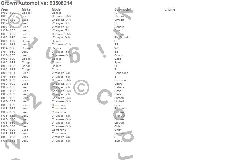Cherokee (XJ), Comanche, Dakota, Wrangler (TJ), Wrangler (YJ), Dodge, Jeep, 1999, 1998, 1997, 1996, 1995, 1994, 1993, 1992, 1991, 1990, 1989, 1988 more…