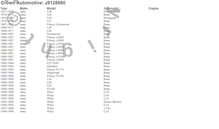 1-Ton Pickup, CJ-2A, CJ-3A, CJ-3B, CJ5, CJ6, CJ7, Commando, FC150, FC170, FC170HD, Gladiator, J-2500, J-2600, J-2700, J-2800, J-3500, J-3600, J-3700, J-3800 more…