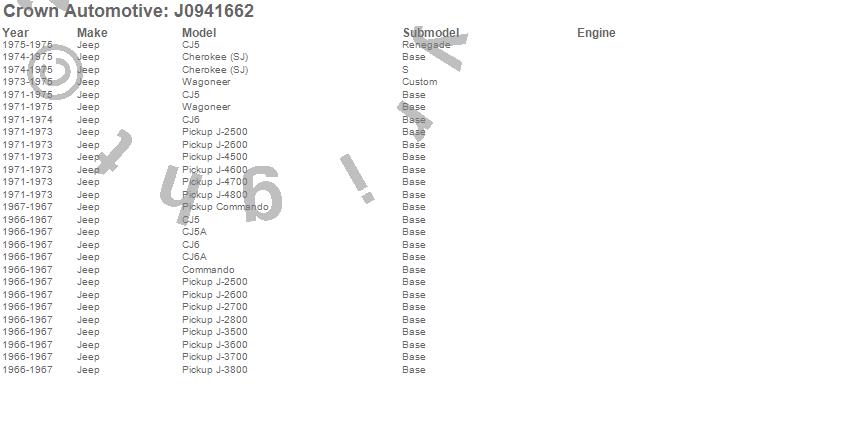 Cherokee (SJ), CJ5, CJ5A, CJ6, CJ6A, Commando, J-2500, J-2600, J-2700, J-2800, J-3500, J-3600, J-3700, J-3800, J-4500, J-4600, J-4700, J-4800, Wagoneer, Jeep more…