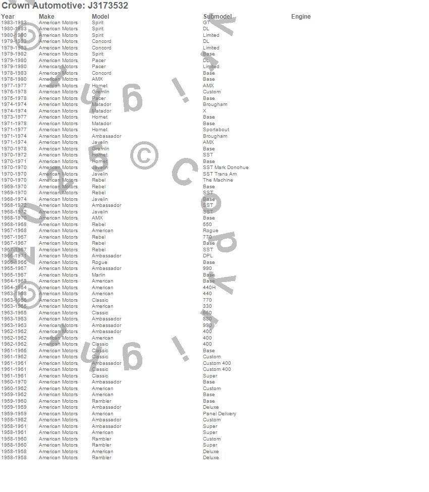 Crown Automotive is the premier manufacturer and distributor of quality replacement parts for Jeep® CJ™, Wrangler™, Cherokee™, Grand Cherokee™, Liberty™, and Commander™."From humble beginnings in 1963 in a small Boston storefront, Crown Automotive has consistently maintained its commitment to offering only quality parts and exceptional service. Today, with warehouses in Massachusetts, Georgia, Nevada, Spain, and the Czech Republic, totaling over 160,000 square feet, Crown Automotive continues to be the leader in quality replacement parts for Jeep® vehicles. With over 8,000 different parts in stock for Jeep® vehicles from 1942 on up, Crown has the largest stock of replacement parts for Jeep® vehicles, including factory-discontinued parts. In fact, many of the older Jeeps are still on (and off) the road thanks to Crown parts. The Crown line consists of axle, body, brake, clutch, cooling, driveline, electrical, engine, exhaust, fuel, steering, suspension, transmission and transfer case components. Crown Automotive also offers an exclusive line of component kits and accessory products. Because we know that Jeeps are driven harder than most other vehicles, we emphasize offering only quality parts. In fact, we test parts on Jeeps before distributing them to our dealers to insure that they meet our standards for quality. Crown also supports its entire line with a 12 month/12,000 mile warranty to insure our dealers and their customers of our commitment to offering quality parts. We know from experience that Jeep® owners would rather pay a little more for a good quality part that's backed by a strong guarantee. But we know that price is important as well. So, not only will you find Crown parts to be of exceptional quality, but you'll find them at a great price too.