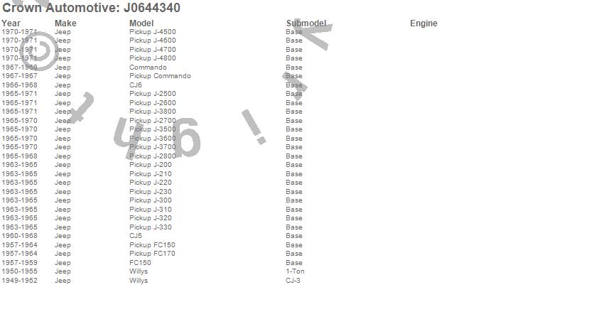1-Ton Pickup, CJ-3A, CJ5, CJ6, Commando, FC150, FC170, J-200, J-210, J-220, J-230, J-2500, J-2600, J-2700, J-2800, J-300, J-310, J-320, J-330, J-3500 more…