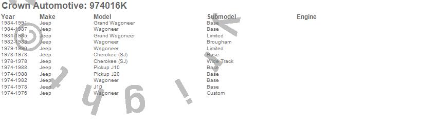 Crown Automotive is the premier manufacturer and distributor of quality replacement parts for Jeep® CJ™, Wrangler™, Cherokee™, Grand Cherokee™, Liberty™, and Commander™."From humble beginnings in 1963 in a small Boston storefront, Crown Automotive has consistently maintained its commitment to offering only quality parts and exceptional service. Today, with warehouses in Massachusetts, Georgia, Nevada, Spain, and the Czech Republic, totaling over 160,000 square feet, Crown Automotive continues to be the leader in quality replacement parts for Jeep® vehicles. With over 8,000 different parts in stock for Jeep® vehicles from 1942 on up, Crown has the largest stock of replacement parts for Jeep® vehicles, including factory-discontinued parts. In fact, many of the older Jeeps are still on (and off) the road thanks to Crown parts. The Crown line consists of axle, body, brake, clutch, cooling, driveline, electrical, engine, exhaust, fuel, steering, suspension, transmission and transfer case components. Crown Automotive also offers an exclusive line of component kits and accessory products. Because we know that Jeeps are driven harder than most other vehicles, we emphasize offering only quality parts. In fact, we test parts on Jeeps before distributing them to our dealers to insure that they meet our standards for quality. Crown also supports its entire line with a 12 month/12,000 mile warranty to insure our dealers and their customers of our commitment to offering quality parts. We know from experience that Jeep® owners would rather pay a little more for a good quality part that's backed by a strong guarantee. But we know that price is important as well. So, not only will you find Crown parts to be of exceptional quality, but you'll find them at a great price too.