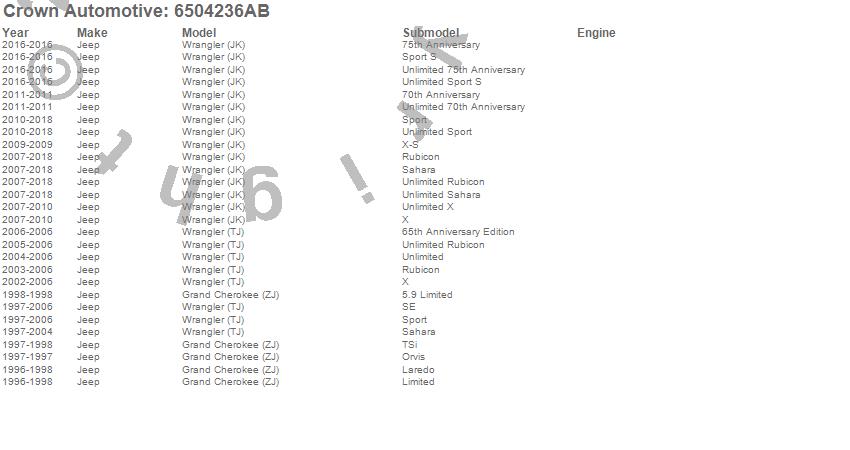 Crown Automotive is the premier manufacturer and distributor of quality replacement parts for Jeep® CJ™, Wrangler™, Cherokee™, Grand Cherokee™, Liberty™, and Commander™."From humble beginnings in 1963 in a small Boston storefront, Crown Automotive has consistently maintained its commitment to offering only quality parts and exceptional service. Today, with warehouses in Massachusetts, Georgia, Nevada, Spain, and the Czech Republic, totaling over 160,000 square feet, Crown Automotive continues to be the leader in quality replacement parts for Jeep® vehicles. With over 8,000 different parts in stock for Jeep® vehicles from 1942 on up, Crown has the largest stock of replacement parts for Jeep® vehicles, including factory-discontinued parts. In fact, many of the older Jeeps are still on (and off) the road thanks to Crown parts. The Crown line consists of axle, body, brake, clutch, cooling, driveline, electrical, engine, exhaust, fuel, steering, suspension, transmission and transfer case components. Crown Automotive also offers an exclusive line of component kits and accessory products. Because we know that Jeeps are driven harder than most other vehicles, we emphasize offering only quality parts. In fact, we test parts on Jeeps before distributing them to our dealers to insure that they meet our standards for quality. Crown also supports its entire line with a 12 month/12,000 mile warranty to insure our dealers and their customers of our commitment to offering quality parts. We know from experience that Jeep® owners would rather pay a little more for a good quality part that's backed by a strong guarantee. But we know that price is important as well. So, not only will you find Crown parts to be of exceptional quality, but you'll find them at a great price too.