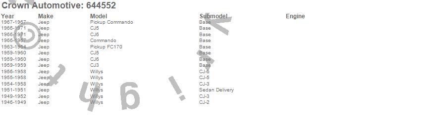 Crown Automotive is the premier manufacturer and distributor of quality replacement parts for Jeep® CJ™, Wrangler™, Cherokee™, Grand Cherokee™, Liberty™, and Commander™."From humble beginnings in 1963 in a small Boston storefront, Crown Automotive has consistently maintained its commitment to offering only quality parts and exceptional service. Today, with warehouses in Massachusetts, Georgia, Nevada, Spain, and the Czech Republic, totaling over 160,000 square feet, Crown Automotive continues to be the leader in quality replacement parts for Jeep® vehicles. With over 8,000 different parts in stock for Jeep® vehicles from 1942 on up, Crown has the largest stock of replacement parts for Jeep® vehicles, including factory-discontinued parts. In fact, many of the older Jeeps are still on (and off) the road thanks to Crown parts. The Crown line consists of axle, body, brake, clutch, cooling, driveline, electrical, engine, exhaust, fuel, steering, suspension, transmission and transfer case components. Crown Automotive also offers an exclusive line of component kits and accessory products. Because we know that Jeeps are driven harder than most other vehicles, we emphasize offering only quality parts. In fact, we test parts on Jeeps before distributing them to our dealers to insure that they meet our standards for quality. Crown also supports its entire line with a 12 month/12,000 mile warranty to insure our dealers and their customers of our commitment to offering quality parts. We know from experience that Jeep® owners would rather pay a little more for a good quality part that's backed by a strong guarantee. But we know that price is important as well. So, not only will you find Crown parts to be of exceptional quality, but you'll find them at a great price too.