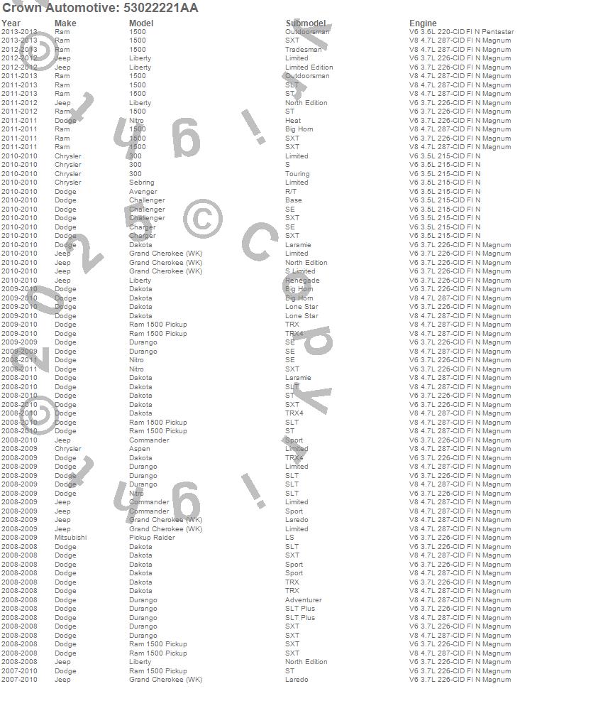 1500, 300, Aspen, Avenger, Challenger, Charger, Commander, Dakota, Durango, Grand Cherokee (WK), Liberty, Nitro, Raider, Ram 1500, Sebring, Chrysler, Dodge, Jeep, Mitsubishi, Ram more…