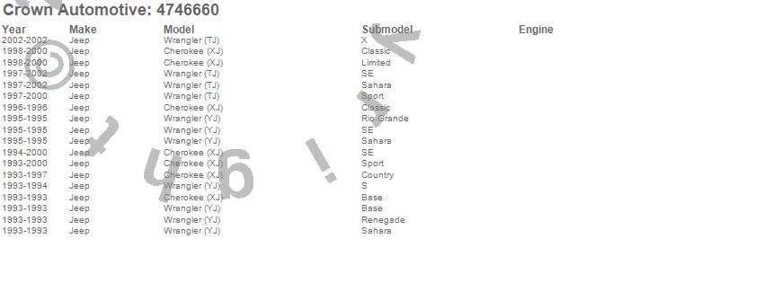 Crown Automotive is the premier manufacturer and distributor of quality replacement parts for Jeep® CJ™, Wrangler™, Cherokee™, Grand Cherokee™, Liberty™, and Commander™."From humble beginnings in 1963 in a small Boston storefront, Crown Automotive has consistently maintained its commitment to offering only quality parts and exceptional service. Today, with warehouses in Massachusetts, Georgia, Nevada, Spain, and the Czech Republic, totaling over 160,000 square feet, Crown Automotive continues to be the leader in quality replacement parts for Jeep® vehicles. With over 8,000 different parts in stock for Jeep® vehicles from 1942 on up, Crown has the largest stock of replacement parts for Jeep® vehicles, including factory-discontinued parts. In fact, many of the older Jeeps are still on (and off) the road thanks to Crown parts. The Crown line consists of axle, body, brake, clutch, cooling, driveline, electrical, engine, exhaust, fuel, steering, suspension, transmission and transfer case components. Crown Automotive also offers an exclusive line of component kits and accessory products. Because we know that Jeeps are driven harder than most other vehicles, we emphasize offering only quality parts. In fact, we test parts on Jeeps before distributing them to our dealers to insure that they meet our standards for quality. Crown also supports its entire line with a 12 month/12,000 mile warranty to insure our dealers and their customers of our commitment to offering quality parts. We know from experience that Jeep® owners would rather pay a little more for a good quality part that's backed by a strong guarantee. But we know that price is important as well. So, not only will you find Crown parts to be of exceptional quality, but you'll find them at a great price too.
