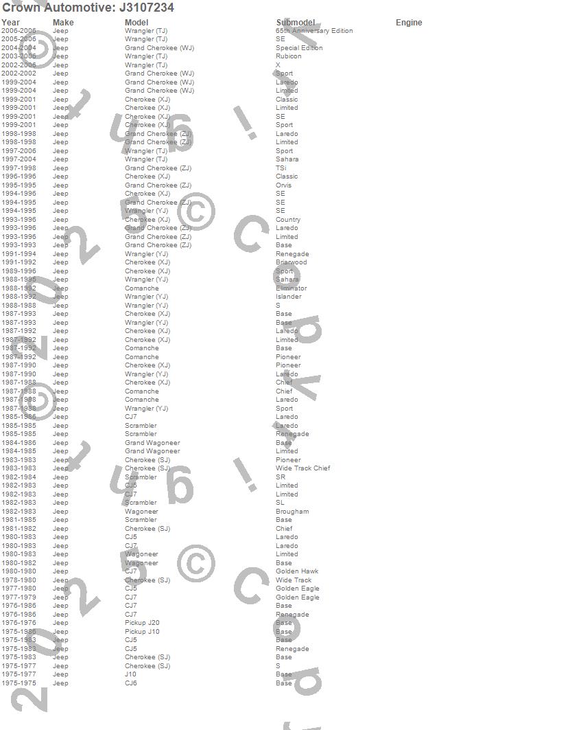 Cherokee (SJ), Cherokee (XJ), CJ5, CJ6, CJ7, Comanche, Grand Cherokee (WJ), Grand Cherokee (ZJ), Grand Wagoneer, J10, J20, Scrambler, Wagoneer, Wrangler (TJ), Wrangler (YJ), Jeep, 2006, 2005, 2004, 2003 more…