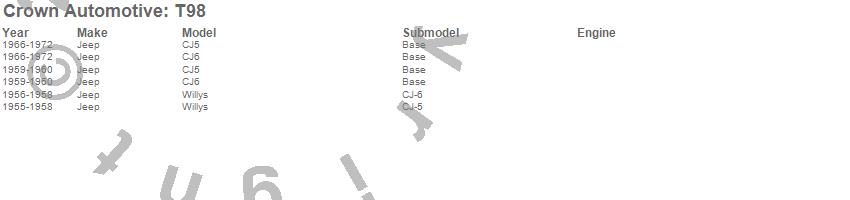 Crown Automotive is the premier manufacturer and distributor of quality replacement parts for Jeep® CJ™, Wrangler™, Cherokee™, Grand Cherokee™, Liberty™, and Commander™."From humble beginnings in 1963 in a small Boston storefront, Crown Automotive has consistently maintained its commitment to offering only quality parts and exceptional service. Today, with warehouses in Massachusetts, Georgia, Nevada, Spain, and the Czech Republic, totaling over 160,000 square feet, Crown Automotive continues to be the leader in quality replacement parts for Jeep® vehicles. With over 8,000 different parts in stock for Jeep® vehicles from 1942 on up, Crown has the largest stock of replacement parts for Jeep® vehicles, including factory-discontinued parts. In fact, many of the older Jeeps are still on (and off) the road thanks to Crown parts. The Crown line consists of axle, body, brake, clutch, cooling, driveline, electrical, engine, exhaust, fuel, steering, suspension, transmission and transfer case components. Crown Automotive also offers an exclusive line of component kits and accessory products. Because we know that Jeeps are driven harder than most other vehicles, we emphasize offering only quality parts. In fact, we test parts on Jeeps before distributing them to our dealers to insure that they meet our standards for quality. Crown also supports its entire line with a 12 month/12,000 mile warranty to insure our dealers and their customers of our commitment to offering quality parts. We know from experience that Jeep® owners would rather pay a little more for a good quality part that's backed by a strong guarantee. But we know that price is important as well. So, not only will you find Crown parts to be of exceptional quality, but you'll find them at a great price too.