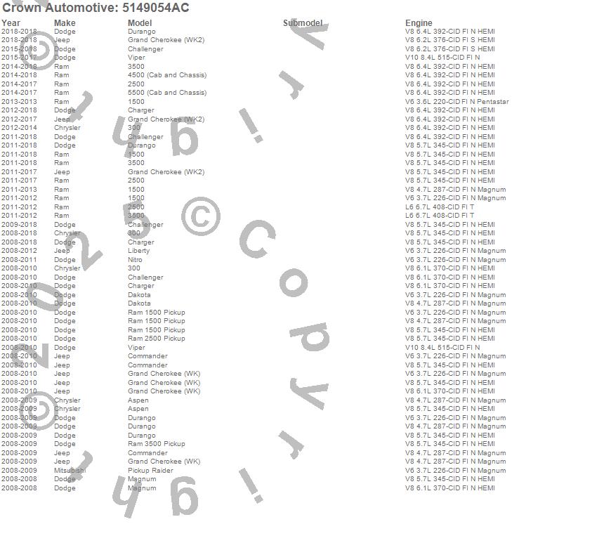 1500, 2500, 300, 3500, Aspen, Challenger, Charger, Commander, Dakota, Durango, Grand Cherokee (WK), Grand Cherokee (WK2), Liberty, Magnum, Nitro, Raider, Ram 1500, Ram 2500, Ram 3500, Viper more…