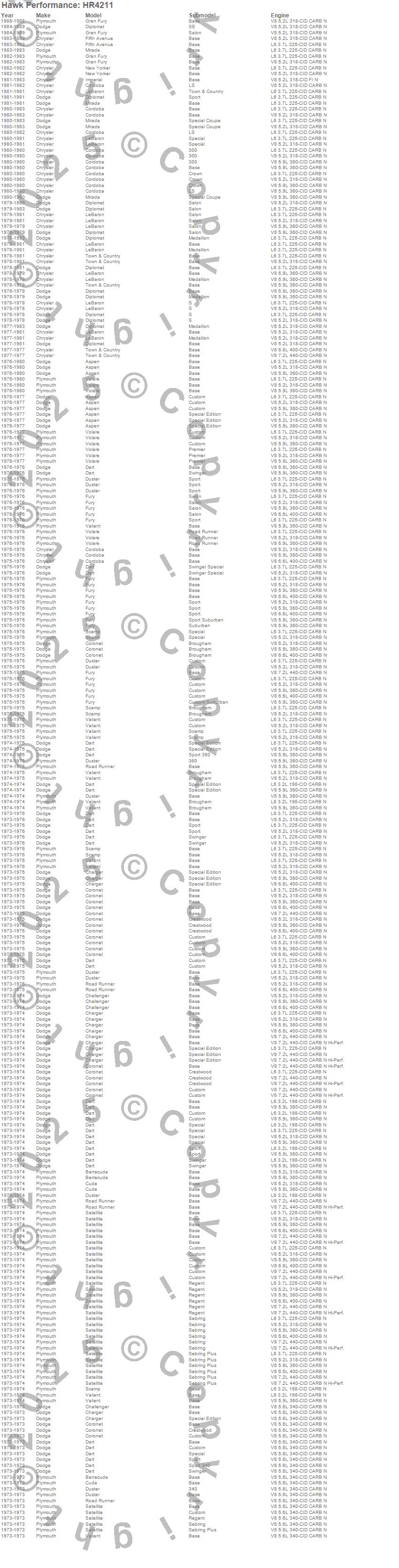 Aspen, Barracuda, Challenger, Charger, Cordoba, Coronet, Cuda, Dart, Diplomat, Duster, Fifth Avenue, Fury, Gran Fury, Imperial, LeBaron, Mirada, New Yorker, Road Runner, Satellite, Scamp more…