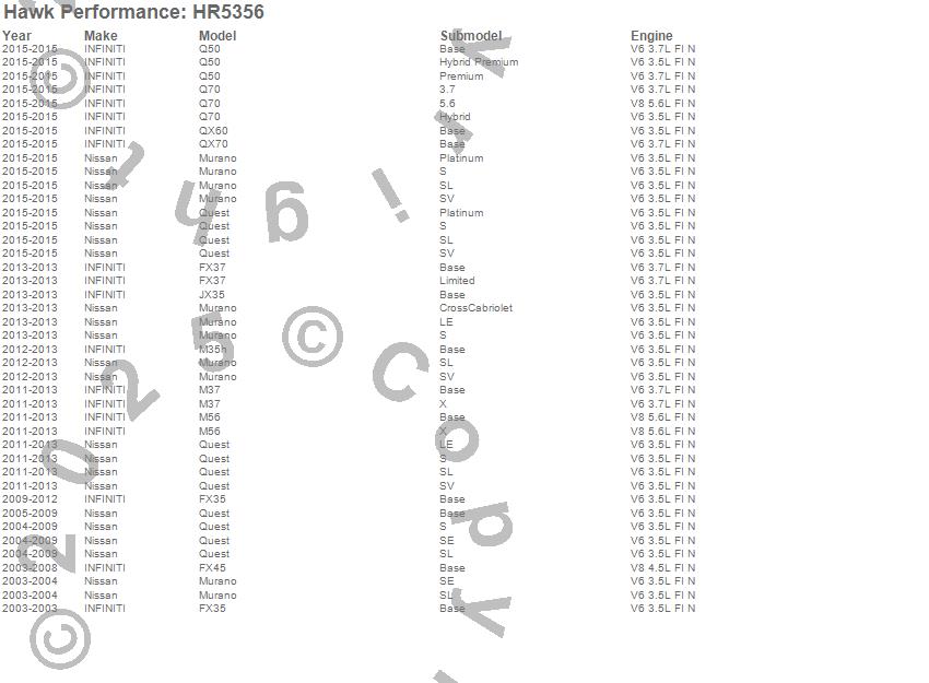 Below is an abreviated list of applications for the Sector 27 Rotor. FX35, FX37, FX45, JX35, M35h, M37, M56, Murano, Quest, Infiniti, Nissan, 2013, 2012, 2011, 2010, 2009, 2008, 2007, 2006, 2005 more…