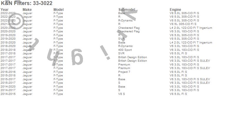 Below is an abreviated list of applications for the Air Filter.