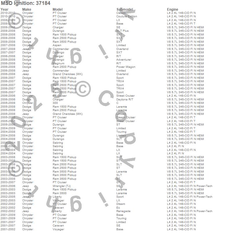300, Aspen, Caravan, Charger, Commander, Durango, Grand Cherokee (WK), Liberty, Magnum, PT Cruiser, Ram 1500, Ram 2500, Ram 3500, Sebring, Voyager, Wrangler (TJ), Chrysler, Dodge, Jeep, 2010 more…