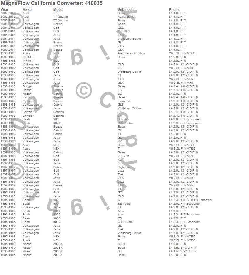 Below is an abreviated list of applications for the Universal California OBDII Compliant Catalytic Converter.