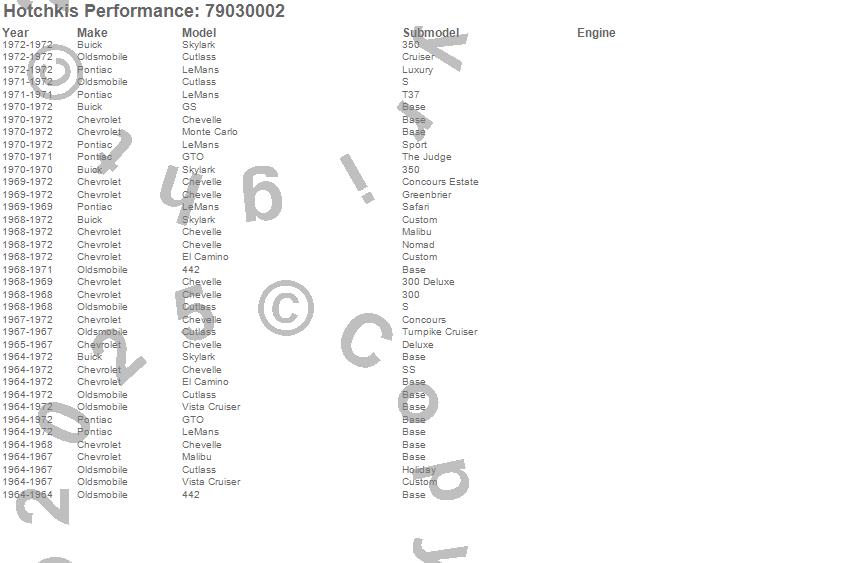 442, Chevelle, Cutlass, Cutlass Supreme, F85, Gran Sport, Grand Prix, GS, GS 350, GS 400, GS 455, GTO, LeMans, Malibu, Monte Carlo, Skylark, Special, Tempest, Vista Cruiser, Buick more…