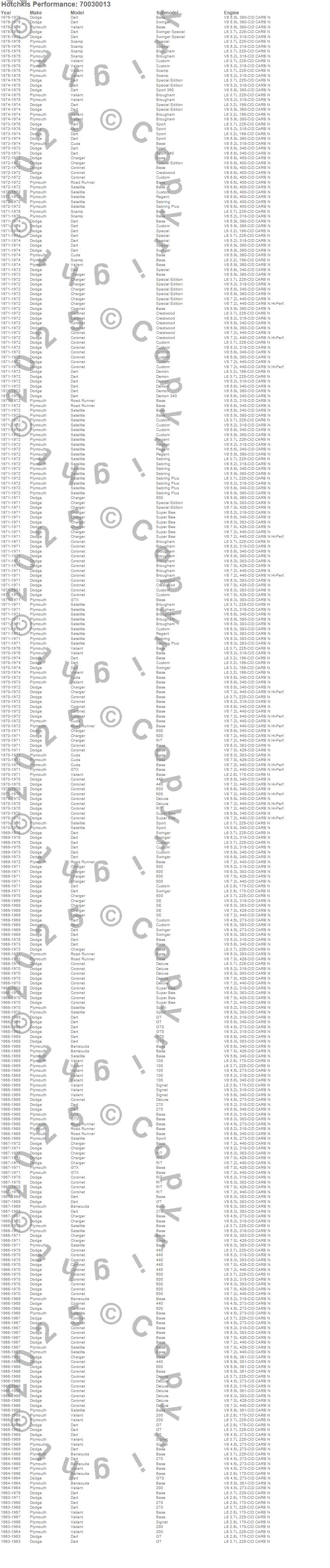 330, 440, Belvedere, Belvedere II, Charger, Cordoba, Coronet, Dart, Fury, GTX, Magnum, Monaco, Polara, Road Runner, Satellite, Savoy, Superbird, Chrysler, Dodge, Plymouth more…