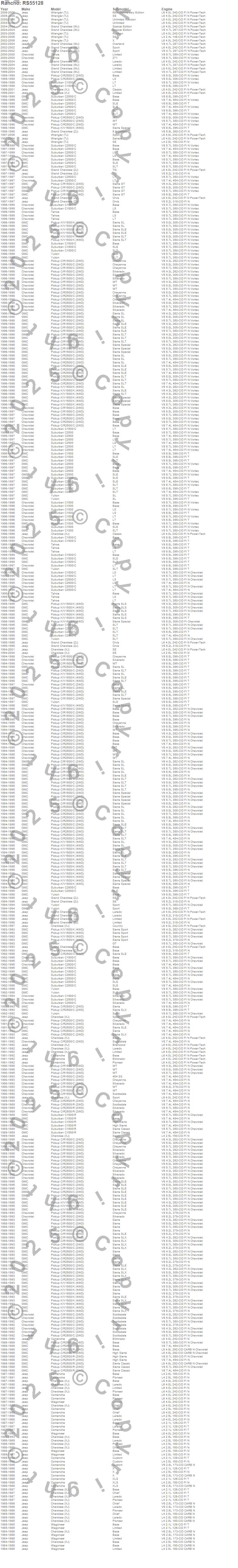 C1500, C1500 Pickup, C1500 Suburban, C2500 Pickup, C2500 Suburban, Cherokee (XJ), Comanche, Grand Cherokee (WJ), Grand Cherokee (ZJ), K1500, K1500 Pickup, R2500 Pickup, Tahoe, Wagoneer, Wrangler (LJ), Wrangler (TJ), Yukon, Chevrolet, GMC, Jeep more…