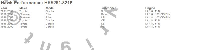 Below is an abreviated list of applications for the Sector 27 Brake Kits. Corolla, Prizm, Chevrolet, Toyota, 2002, 2001, 2000, 1999, 1998 more…
