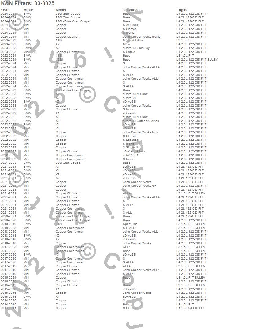 Below is an abreviated list of applications for the Air Filter.