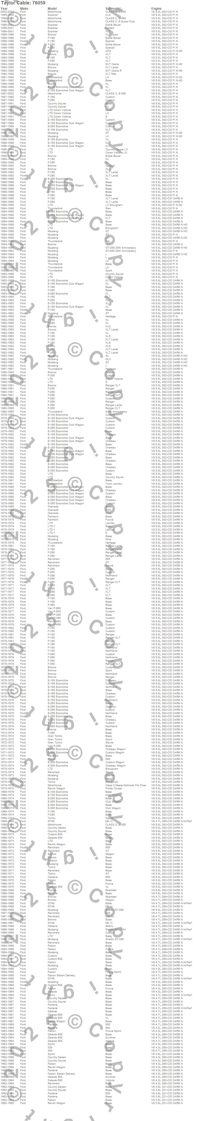 Bronco, Club, Club Cargo, Club Wagon, Country Sedan, Country Squire, Custom, Custom 500, E-100 Econoline, E-150 Econoline, E-150 Econoline Club Wagon, E-200 Econoline, E-250 Econoline, E-300 Econoline, E-350 Econoline, Explorer, F-100, F-150, F-250, F-350 more…