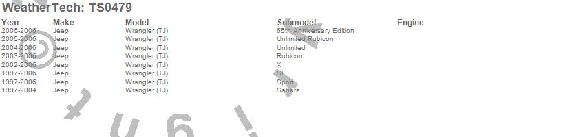 Below is an abreviated list of applications for the WeatherTech TechShade. Wrangler (LJ), Wrangler (TJ), Jeep, 2006, 2005, 2004, 2003, 2002, 2001, 2000, 1999, 1998, 1997 more…