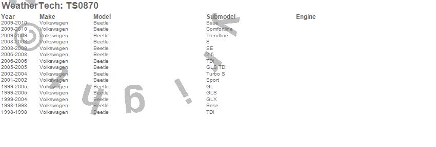 Below is an abreviated list of applications for the WeatherTech TechShade. Beetle, Volkswagen, 2010, 2009, 2008, 2007, 2006, 2005, 2004, 2003, 2002, 2001, 2000, 1999, 1998 more…