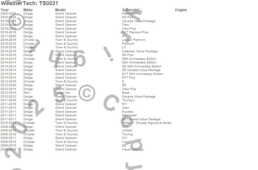 Below is an abreviated list of applications for the WeatherTech TechShade. C/V, Grand Caravan, Town & Country, Chrysler, Dodge, Ram, 2015, 2014, 2013, 2012, 2011, 2010, 2009, 2008 more…