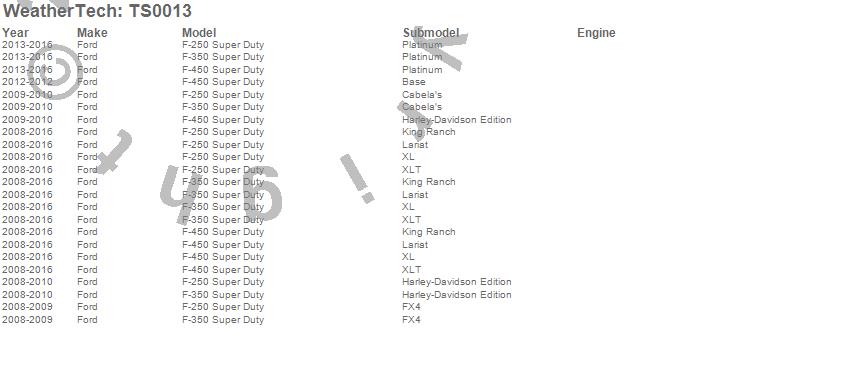 Below is an abreviated list of applications for the WeatherTech TechShade. F-250 Super Duty, F-350 Super Duty, F-450 Super Duty, Ford, 2015, 2014, 2013, 2012, 2011, 2010, 2009, 2008 more…