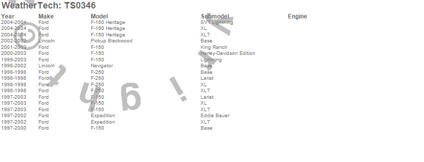 Below is an abreviated list of applications for the WeatherTech TechShade. Blackwood, Expedition, F-150, F-150 Heritage, F-250, Navigator, Ford, Lincoln, 2004, 2003, 2002, 2001, 2000, 1999, 1998, 1997, 1996 more…