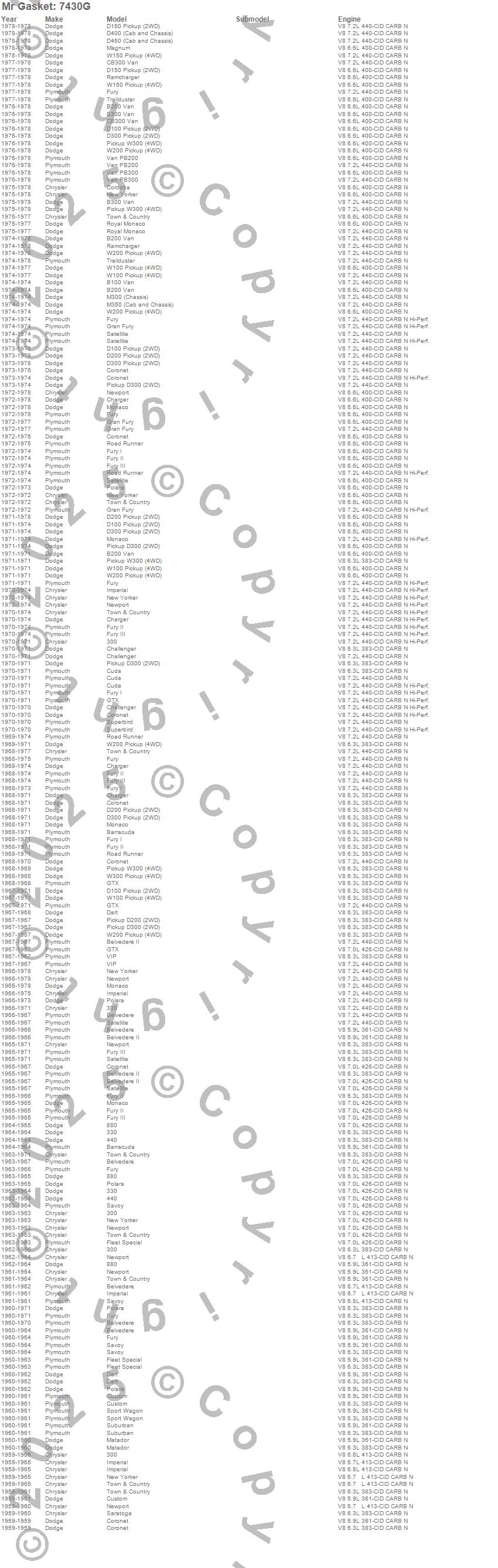 300, 330, 440, 880, B100 Van, B200 Van, B300 Van, Barracuda, Belvedere, Belvedere II, CB300 Van, Challenger, Charger, Cordoba, Coronet, Cuda, Custom, D100 Pickup, D150 Pickup, D200 Pickup more…