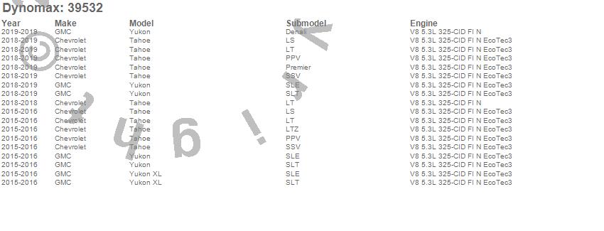 Below is an abreviated list of applications for the Stainless Steel Cat-Back Exhaust System.Tahoe, Yukon, Yukon XL, Chevrolet, GMC, 2015 more…