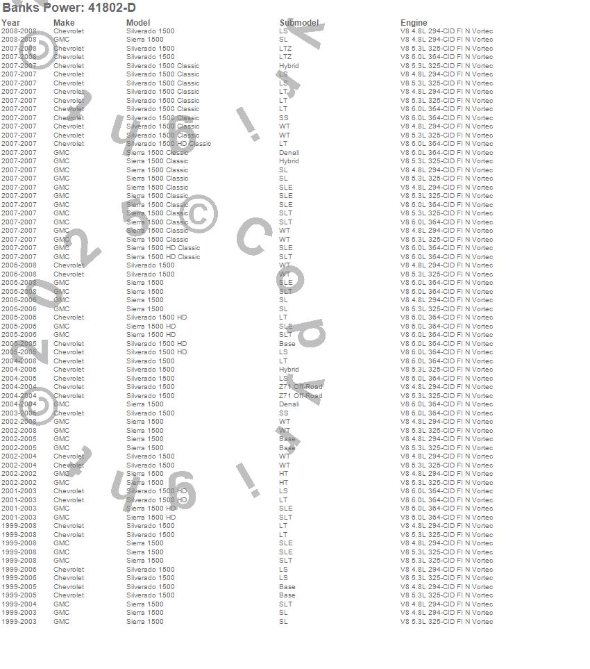 Below is an abreviated list of applications for the Banks Ram-Air Intake System.