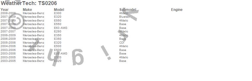 Below is an abreviated list of applications for the WeatherTech TechShade. E280, E300, E320, E350, E500, E55 AMG, E550, E63 AMG, Mercedes-Benz, 2009, 2008, 2007, 2006, 2005, 2004, 2003 more…