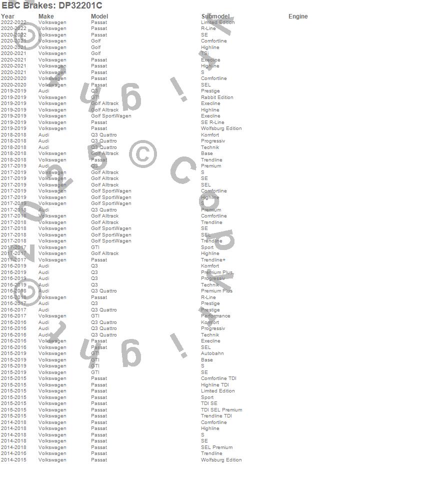 Below is an abreviated list of applications for the EBC Redstuff Ceramic Low Dust Brake Pads.
