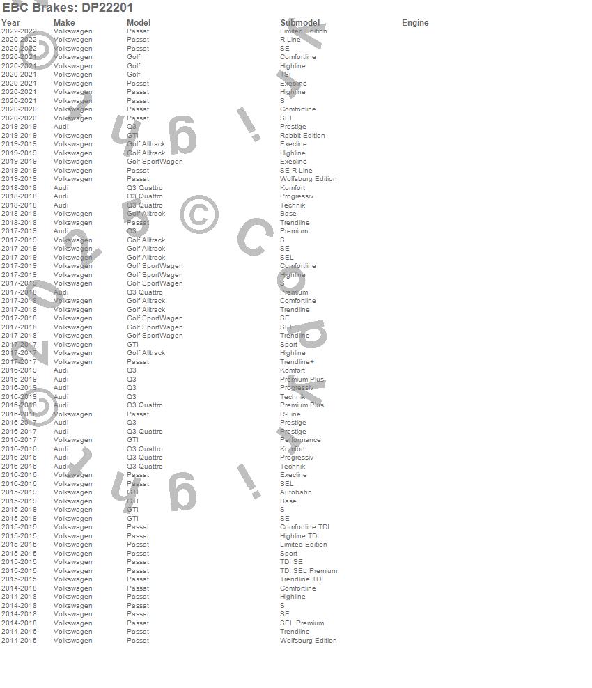 Below is an abreviated list of applications for the EBC Greenstuff 2000 Series Sport Brake Pads.