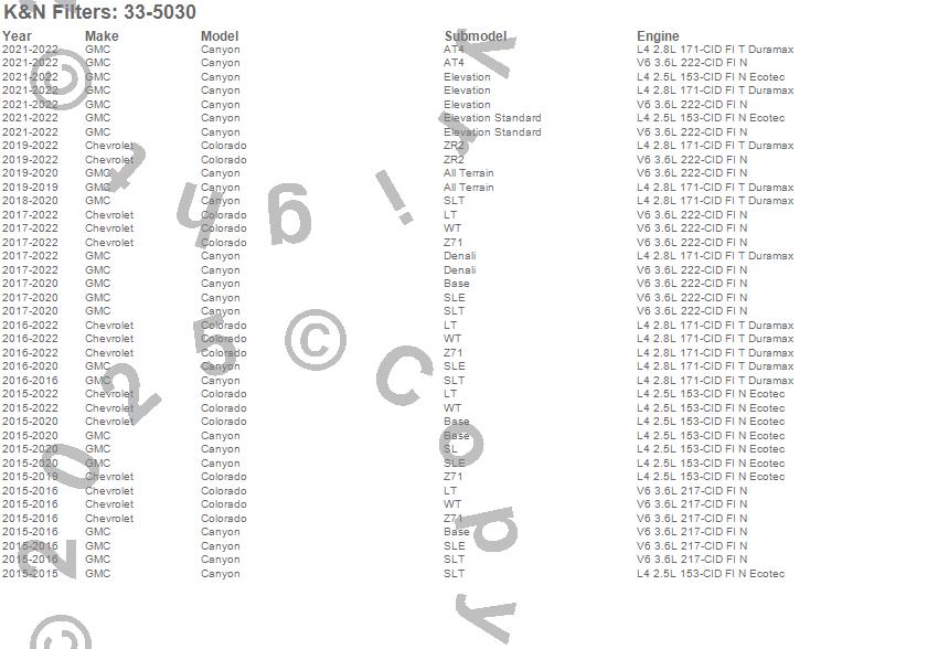 Below is an abreviated list of applications for the Air Filter.