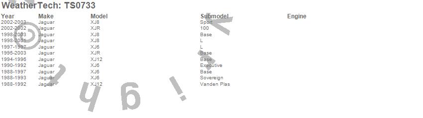 Below is an abreviated list of applications for the WeatherTech TechShade. XJ12, XJ6, XJ8, XJR, Jaguar, 2003, 2002, 2001, 2000, 1999, 1998, 1997, 1996, 1995, 1994, 1993, 1992, 1991, 1990, 1989 more…