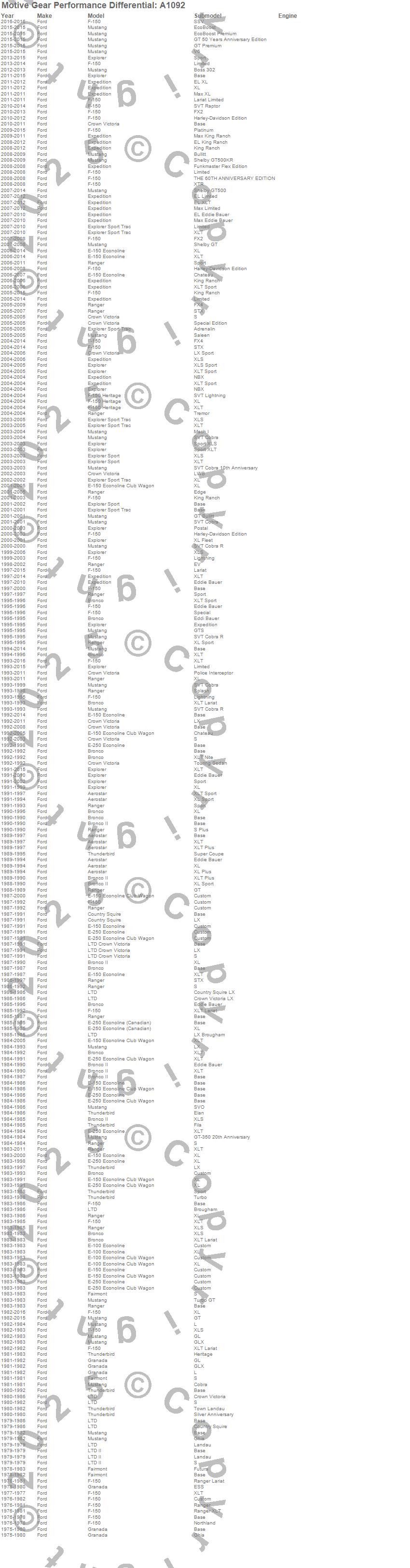 Aerostar, Bronco, Bronco II, Country Squire, Crown Victoria, E-100 Econoline, E-100 Econoline Club Wagon, E-150 Econoline, E-150 Econoline Club Wagon, E-250 Econoline, E-250 Econoline Club Wagon, Expedition, Explorer, Explorer Sport Trac, F-150, F-150 Heritage, Fairmont, Granada, LTD, LTD Crown Victoria more…