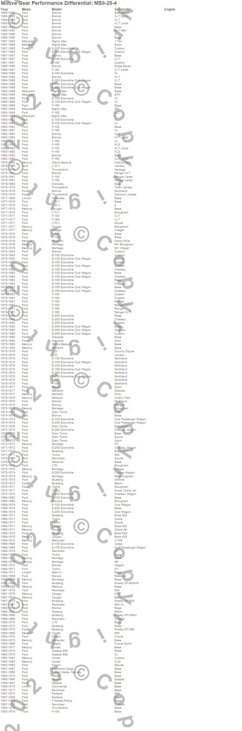 Bronco, Comet, Continental, Cougar, E-100 Econoline, E-100 Econoline Club Wagon, E-150 Econoline, E-150 Econoline Club Wagon, E-200 Econoline, E-250 Econoline, E-250 Econoline Club Wagon, E-300 Econoline, Econoline Cargo, F Series, F-100, F-150, Fairlane, Falcon, Falcon Sedan Delivery, Galaxie more…