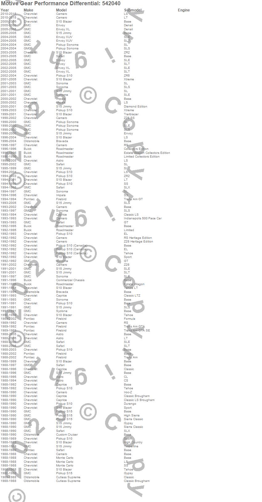 Astro, Bravada, Camaro, Caprice, Commercial Chassis, Custom Cruiser, Cutlass Supreme, Envoy, Envoy XL, Envoy XUV, Firebird, Impala, Monte Carlo, Roadmaster, S10 Blazer, S10 Blazer (Canadian), S10 Pickup, S15 Jimmy, S15 Pickup, Safari more…