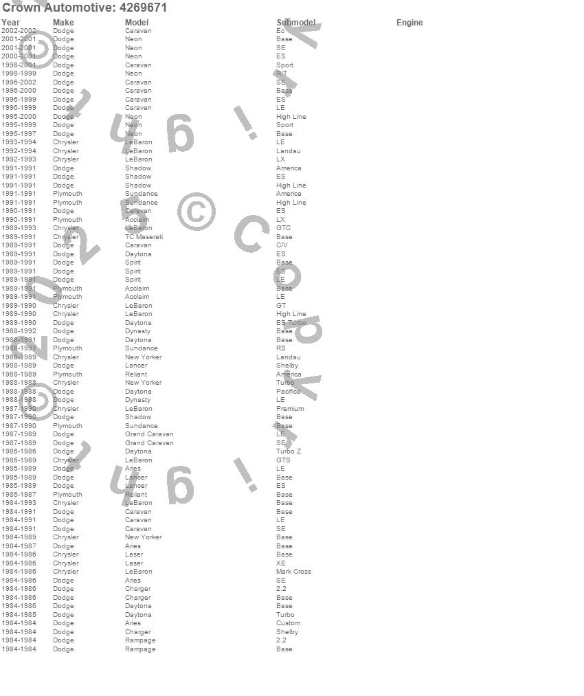Acclaim, Aries, Caravan, Charger, Daytona, Dynasty, Grand Caravan, Lancer, Laser, LeBaron, Neon, New Yorker, Rampage, Reliant, Shadow, Spirit, Sundance, TC Maserati, Chrysler, Dodge more…