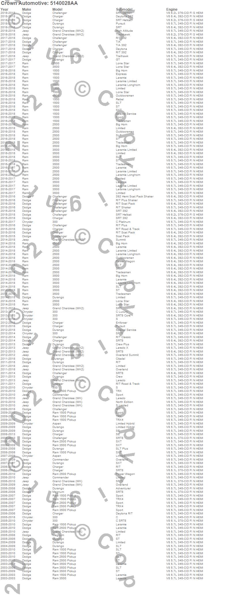 2500, 300, 3500, Aspen, Challenger, Charger, Commander, Durango, Grand Cherokee (WK), Grand Cherokee (WK2), Magnum, Ram 1500, Ram 2500, Ram 3500, Chrysler, Dodge, Jeep, Ram, 2015, 2014 more…