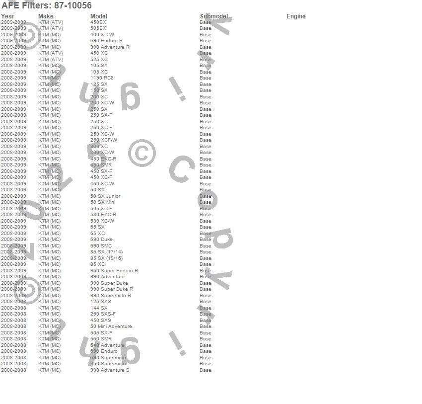 105 SX, 105 XC, 1190 RC8, 125 SX, 125 SXS, 144 SX, 150 SX, 200 XC, 200 XC-W, 250 SX, 250 SX-F, 250 SXS-F, 250 XC, 250 XC-F, 250 XC-W, 250 XCF-W, 300 XC, 300 XC-W, 400 XC-W, 450 EXC-R more…