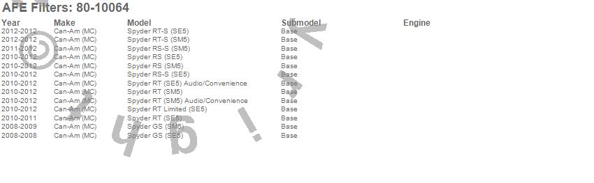 Spyder GS (SE5), Spyder GS (SM5), Spyder RS (SE5), Spyder RS (SM5), Spyder RS-S (SE5), Spyder RS-S (SM5), Spyder RT (SE5), Spyder RT (SE5) Audio/Convenience, Spyder RT (SM5), Spyder RT (SM5) Audio/Convenience, Spyder RT Limited (SE5), Spyder RT-S (SE5), Spyder RT-S (SM5), Can-Am (MC), 2012, 2011, 2010, 2009, 2008 more…