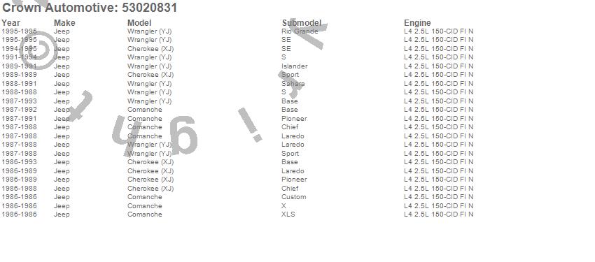 Crown Automotive is the premier manufacturer and distributor of quality replacement parts for Jeep® CJ™, Wrangler™, Cherokee™, Grand Cherokee™, Liberty™, and Commander™."From humble beginnings in 1963 in a small Boston storefront, Crown Automotive has consistently maintained its commitment to offering only quality parts and exceptional service. Today, with warehouses in Massachusetts, Georgia, Nevada, Spain, and the Czech Republic, totaling over 160,000 square feet, Crown Automotive continues to be the leader in quality replacement parts for Jeep® vehicles. With over 8,000 different parts in stock for Jeep® vehicles from 1942 on up, Crown has the largest stock of replacement parts for Jeep® vehicles, including factory-discontinued parts. In fact, many of the older Jeeps are still on (and off) the road thanks to Crown parts. The Crown line consists of axle, body, brake, clutch, cooling, driveline, electrical, engine, exhaust, fuel, steering, suspension, transmission and transfer case components. Crown Automotive also offers an exclusive line of component kits and accessory products. Because we know that Jeeps are driven harder than most other vehicles, we emphasize offering only quality parts. In fact, we test parts on Jeeps before distributing them to our dealers to insure that they meet our standards for quality. Crown also supports its entire line with a 12 month/12,000 mile warranty to insure our dealers and their customers of our commitment to offering quality parts. We know from experience that Jeep® owners would rather pay a little more for a good quality part that's backed by a strong guarantee. But we know that price is important as well. So, not only will you find Crown parts to be of exceptional quality, but you'll find them at a great price too.