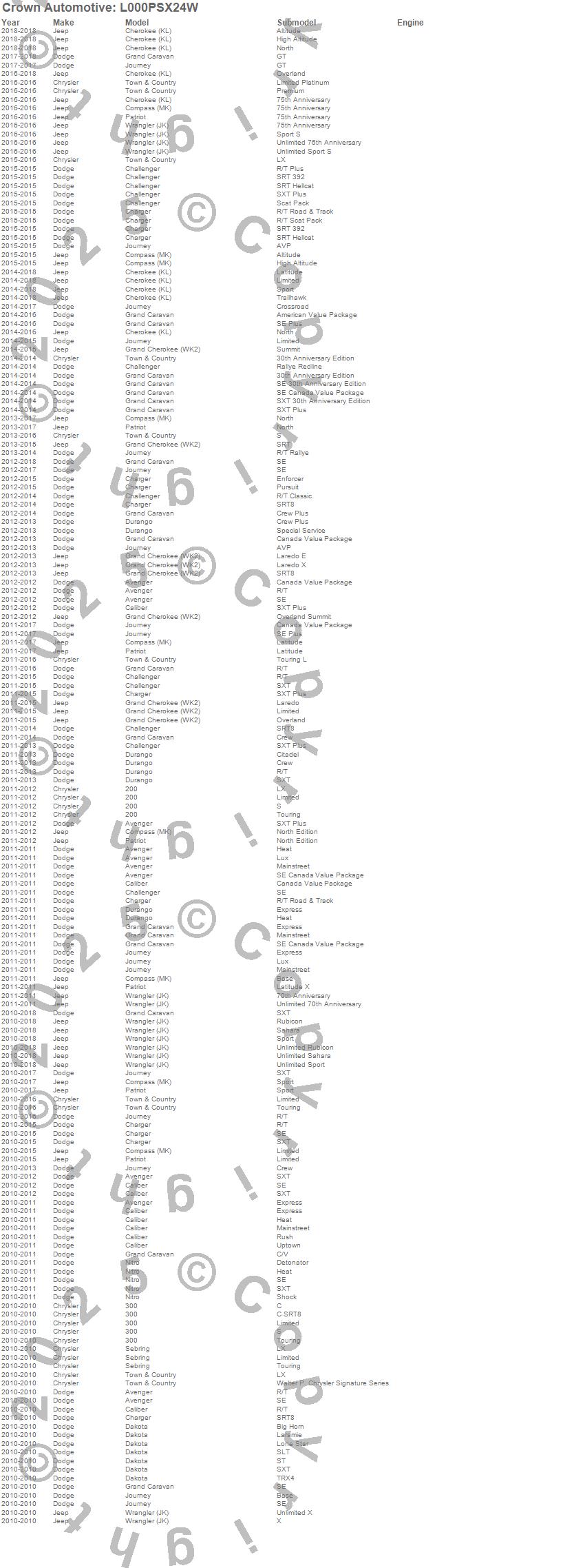 200, 300, Avenger, Caliber, Challenger, Charger, Cherokee (KL), Compass, Dakota, Durango, Grand Caravan, Grand Cherokee (WK2), Journey, Nitro, Patriot, Raider, Sebring, Town & Country, Wrangler (JK), Chrysler more…